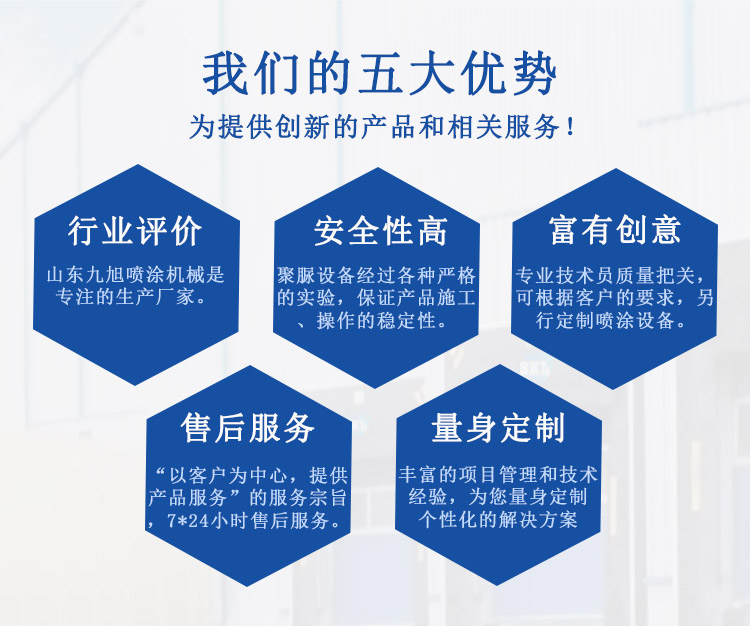 ? ?  山東九旭機械科技有限公司是一家以聚氨酯設備及聚脲設備研發,生產,銷售,售后服務為一體的技術服務型企業。目前公司已成長為國內主要的聚合機械設備專業制造企業之一,產品銷售遍布全國各地,并遠銷國外多個國家。